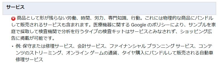 Google ショッピングのポリシーを読むと、その内容は非常に明確です。労働、時間、専門性など、物理的な所有権が移転しないサービスの販売は禁止であり、物理的な所有権が移転できる商品であることが前提とされています。文言上の曖昧さは、ほとんどありません。
