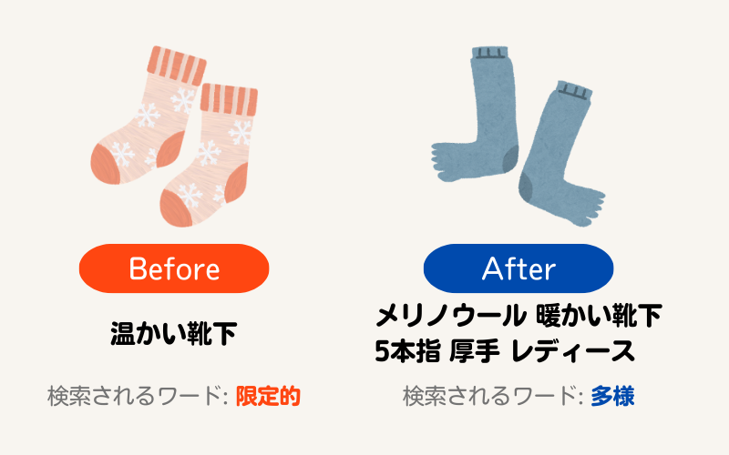 これでは、お客様が「メリノウール 靴下」「5本指 靴下 レディース」「厚手 ソックス グレー」といった具体的なワードで検索しても、あなたの商品は表示されません。