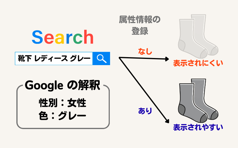 これらの属性を正しく登録することで、「レディース 靴下 グレー」「メリノウール ソックス」といった検索がされたときに、検索結果に商品が表示されやすくなります。